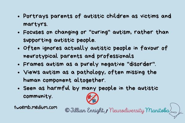 I don't support Autism Speaks, nor any organization which speaks over Autistics and supports behaviourism-based “treatment” for autism. Autism Speaks has a long history of characterizing autism as a hideous, terrifying monster which parents should avoid at all costs — including their child’s mental health.